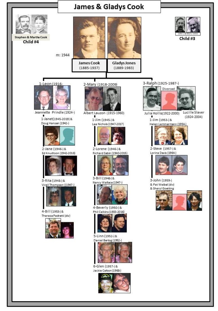 James & Gladys Cook are covered in Chapter 1 of Book 3 on the Cook-Hatch. Gladys Jones family will be included in Book 4 on the Jones-Harr family.