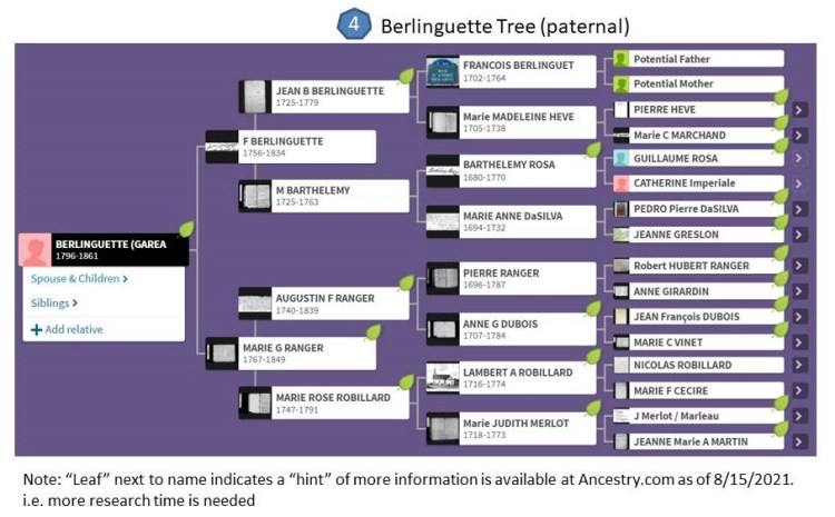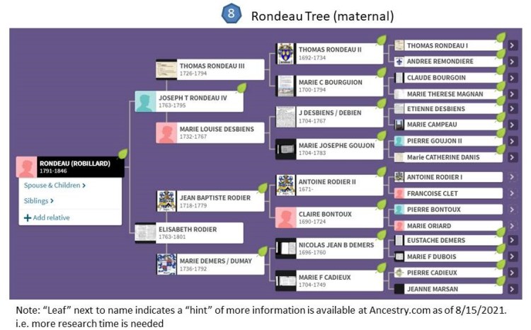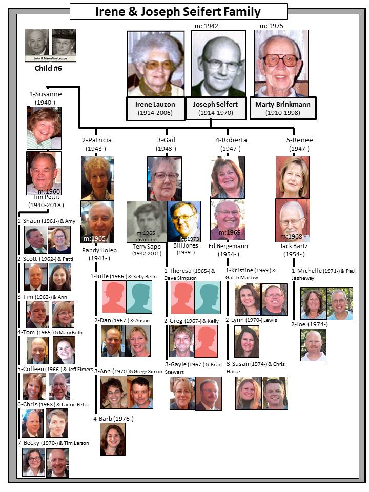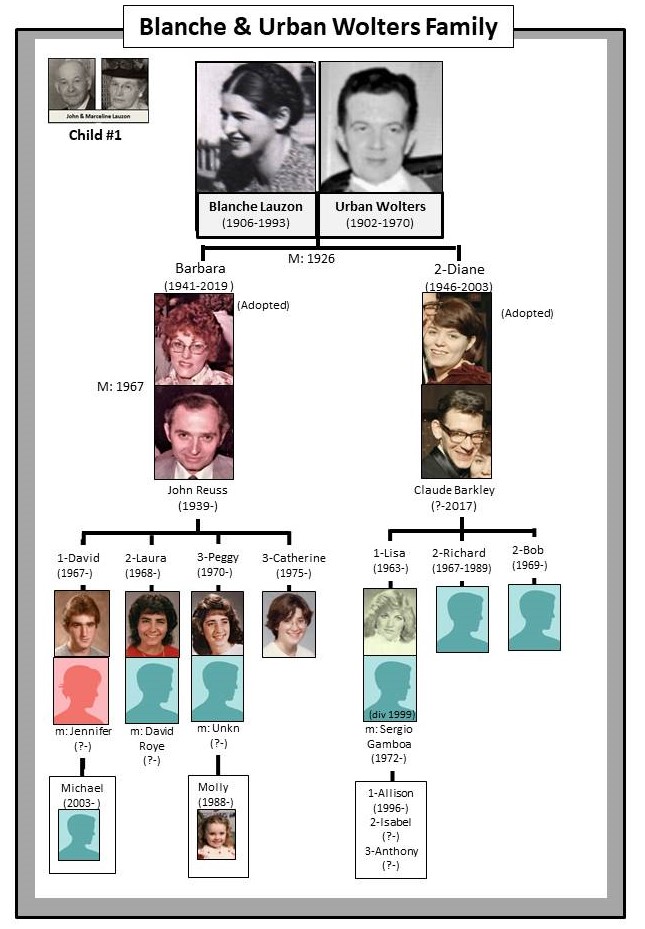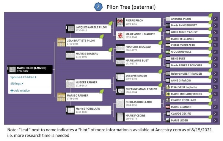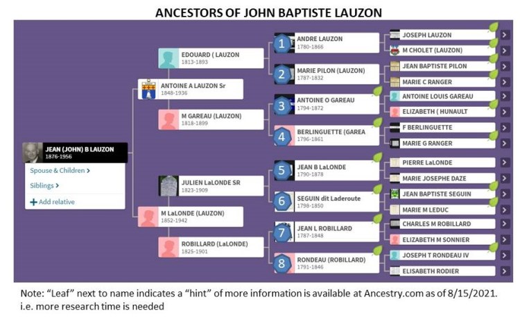 Our biographical sketches are organized by family. For John Lauzon, the families are numbered below on his pedigree chart. Scroll down to see the various families. The bio-Sketches have NOT been written yet, but when ready to publish they will follow the pedigree chart of the ancestor shown in the chart.