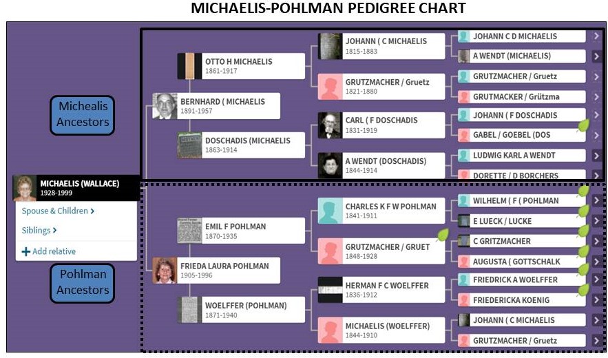 These are the biographies of Lois Michaelis Wallace’s maternal ancestors. The numbers on the pedigree chart indicate the biography ID #.